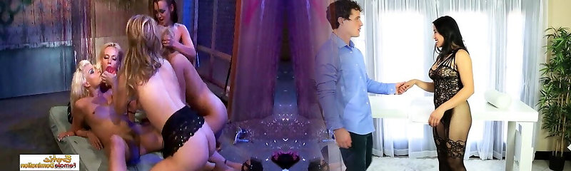 A massage promptly turns into a lesbian group fuckfest session with plenty of sex toys to cum with