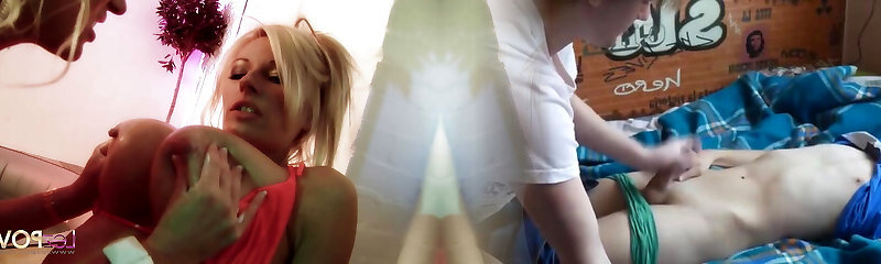 Blonde virgin with tattoos massaged by sizzling masseuse