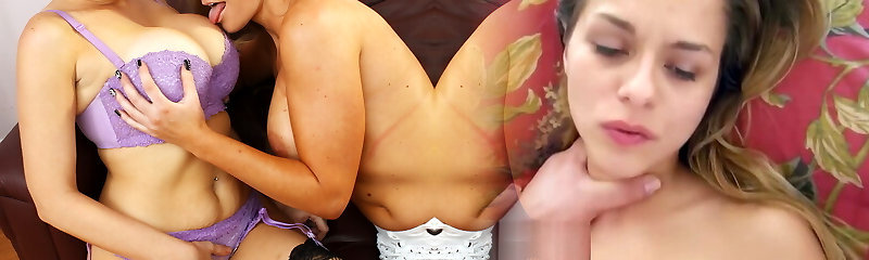 Two lesbian babes in high heels, Tiffany and Cassie are having a great threesome, on the sofa