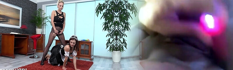 Slender Legs Of Her Sexy Slim Blonde Mistress Make a Magnificent Brunette Maid Lose Her Mind