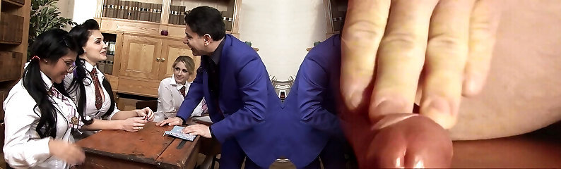 MILF with huge white boobies plays with Asian students in lesbian threesome