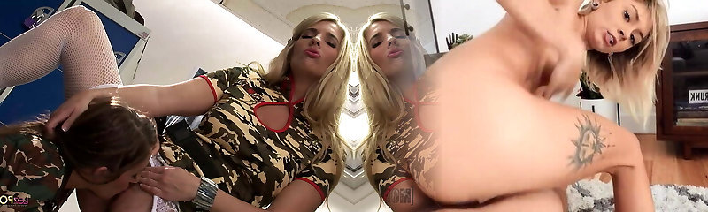 Lesbo army girls pick outfits and get aroused as they take out their double concluded dildo to fuck