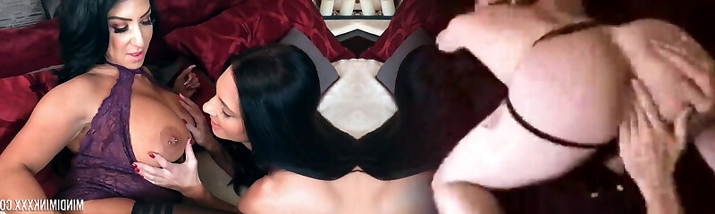 Shyla Jennings and Mindi Mink in stocking having sex on the sofa