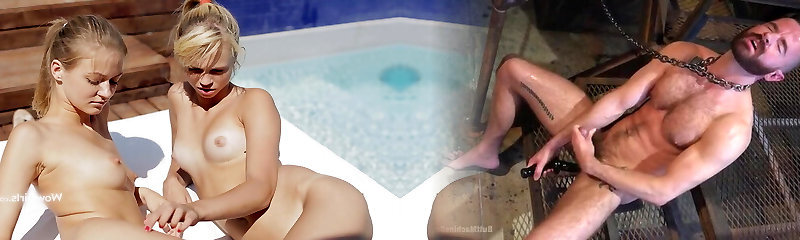 Bony sluts Polly Peltrova and Natasha Rios have assfuck sex in a pool