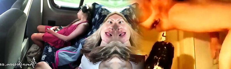 Lesbian fucked mature milf in the car. Big tits and fat ass in cool undergarments. POV.